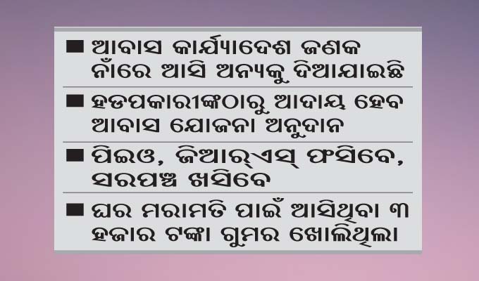 ନୟାଗଡ଼ ଅଫିସ/ଓଡ଼ଗାଁ,୩ା୩(ସ୍ବ.ପ୍ର.): ନୟାଗଡ଼ ଜିଲା ଓଡ଼ଗାଁ ବ୍ଲକ ବରସାହି ପଞ୍ଚାୟତ ସିଙ୍ଗାରପୁର ଗାଁରେ ପ୍ରଧାନମନ୍ତ୍ରୀ ଆବାସ ଯୋଜନାରେ ମିଥ୍ୟା ସତ୍ୟପାଠରେ ଜାଲିଆତି କରାଯାଇଥିବା ପ୍ରାଥମିକ ତଦନ୍ତରୁ ଜଣାପଡିଛି। ଜଣକ ନାଁରେ ଆସିଥିବା ଆବାସ କାର୍ଯ୍ୟାଦେଶକୁ ଅନ୍ୟ ଜଣଙ୍କୁ ଦେଇ ପଞ୍ଚାୟତ...
