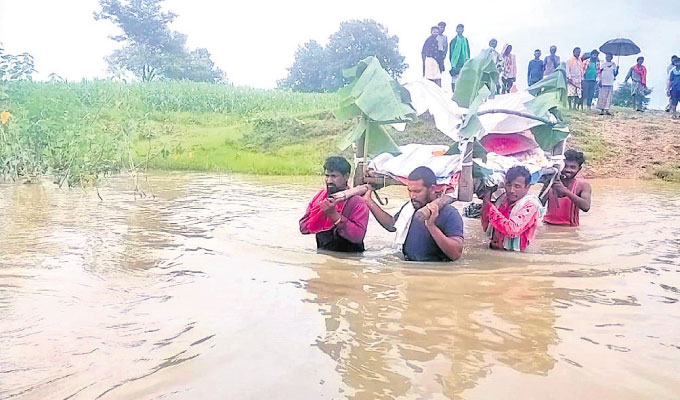 ଛାତିଏ ପାଣିରେ ପଶି ମୃତଦେହକୁ ନେଲେ ଶ୍ମଶାନ