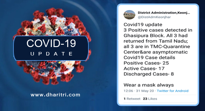 କେନ୍ଦୁଝରରେ ଆଉ ୩ କରୋନା ପଜିଟିଭ୍ ଚିହ୍ନଟ, ଜିଲାରେ ମୋଟ୍ ଆକ୍ରାନ୍ତଙ୍କ ସଂଖ୍ୟା ୨୫ରେ ପହଞ୍ଚିଲା