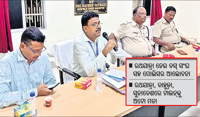 ପୁରୀ ଅଫିସ,୧୧।୬: ଆସନ୍ତା ୨୦ତାରିଖରୁ ଘୋଷଯାତ୍ରା ଅନୁଷ୍ଠିତ ହେବାକୁ ଯାଉଛି। ଏ ନେଇ ସମସ୍ତ ପ୍ରସ୍ତୁତି ଜୋରସୋର ଚାଲିଥିବା ବେଳେ ଶନିବାର ଟ୍ରାଫିକ ପୋଲିସ ଏବଂ ଶ୍ରୀକ୍ଷେତ୍ର ଅଟୋ ଚାଳକ ସଂଘ ଓ ଅଟୋ ଚାଳକ ମହାସଂଘ ମଧ୍ୟରେ ଏକ...