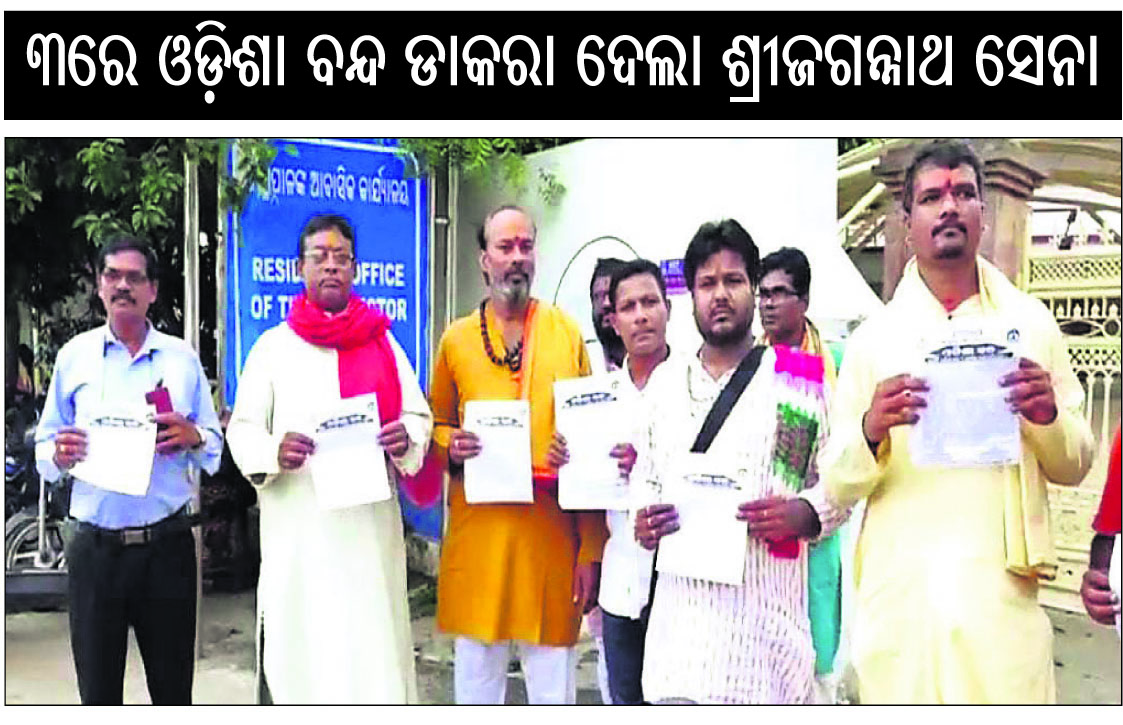 ପୁରୀ,୨୪।୯(ଅଜିତ୍ ମହାନ୍ତି): ଭକ୍ତମାନଙ୍କ ପାଇଁ ଶ୍ରୀମନ୍ଦିର ଚାରିଦ୍ୱାର ଖୋଲିବା ନେଇ ଅନେକ ଦିନ ହେବ ବିଭିନ୍ନ ଅନୁଷ୍ଠାନ ପକ୍ଷରୁ ଦାବି କରାଯାଉଛି। ଏପରି କି ଶ୍ରୀମନ୍ଦିର ଚାରିଦ୍ୱାର ଖୋଲିବା ଦାବି କରି ଶ୍ରୀଜଗନ୍ନାଥ ସେନା ତରଫରୁ ଆସନ୍ତା ୪ ତାରିଖରେ...