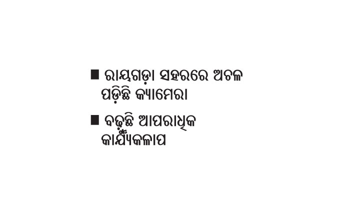 ରାୟଗଡ଼ା,୧୫।୨(ସ୍ବ.ପ୍ର.): ରାୟଗଡ଼ା ଜିଲା ସଦର ମହକୁମାରେ ଚୋରି, ଲୁଟ ଏବଂ ଡକାୟତି ବଢୁଛି। ଏହାକୁ ନିୟନ୍ତ୍ରଣ କରିବା ଏବଂ ଲୋକଙ୍କୁ ସୁରକ୍ଷା ଯୋଗାଇବା ଏବେ ପୋଲିସ ପାଇଁ ମଧ୍ୟ କାଠିକର ପାଠ ହେଇଛି। ସହରରେ ଦିନକୁ ଦିନ ଅପରାଧିକ କାର୍ଯ୍ୟକଳାପ...