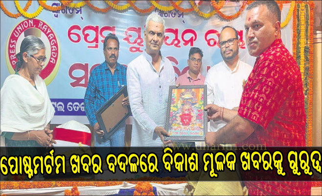 ରାୟଗଡ଼ା ଅଫିସ/ରାୟଗଡ଼ା(ସ୍ବ.ପ୍ର.),୨ା୨: ରାୟଗଡ଼ା ପ୍ରେସ୍ ୟୁନିୟନର ୭ମ ବାର୍ଷିକ ଉତ୍ସବ ବୁଧବାର ସ୍ଥାନୀୟ ତେଜସ୍ବୀ ଇଣ୍ଟରନ୍ୟାଶନାଲ ହୋଟେଲଠାରେ ପାଳନ କରାଯାଇଛି। ଏଥିରେ ମୁଖ୍ୟ ଅତିଥି ଭାବେ ଧରିତ୍ରୀ ଏବଂ ଓଡ଼ିଶାପୋଷ୍ଟର ସମ୍ପାଦକ ତଥାଗତ ସତପଥୀ ଯୋଗଦେଇ ଗଣମାଧ୍ୟମରେ ପୋଷ୍ଟମର୍ଟମ ରିପୋର୍ଟର...