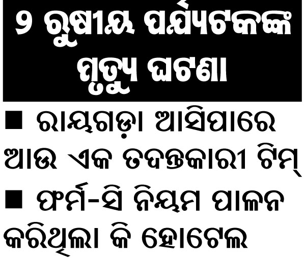 ରାୟଗଡ଼ା,୨ା୧(ସ୍ବ.ପ୍ର.): ରାୟଗଡ଼ାଠାରେ ରୁଷୀୟ ପର୍ଯ୍ୟଟକ ତଥା ସେଠାକାର ଏମ୍ପି ପାଭେଲ ଆଣ୍ଟୋଭ ଏବଂ ତାଙ୍କ ବନ୍ଧୁ ଭ୍ଲାଡିମିର ବିଦାନୋଭଙ୍କ ରହସ୍ୟଜନକ ମୃତ୍ୟୁ ଘଟଣାରେ କ୍ରାଇମବ୍ରାଞ୍ଚ ତଦନ୍ତ ଜାରି ରଖିଛି। ଚତୁର୍ଥ ଦିନ ସୋମବାର ଡିଏସ୍ପି ସରୋଜକାନ୍ତ ମହାନ୍ତଙ୍କ ନେତୃତ୍ୱରେ ୪...