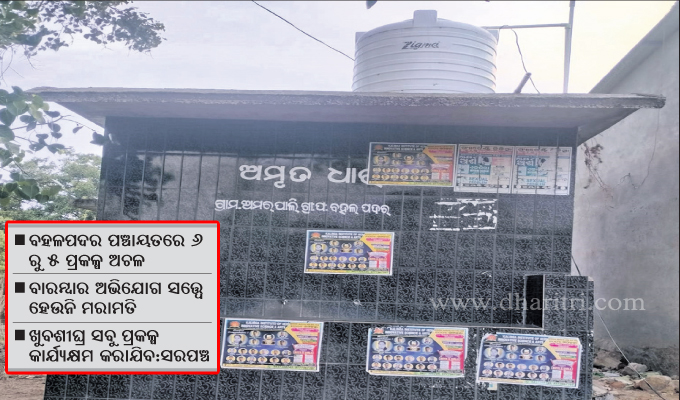 ଅମରପାଲି,୧୬ା୬ (ପୀତାମ୍ବର ସାହୁ): ସୁବର୍ଣ୍ଣପୁର ଜିଲା ବୀରମହାରାଜପୁର ବ୍ଲକ ଅନ୍ତର୍ଗତ ବହଳପଦର ଗ୍ରାମ ପଞ୍ଚାୟତରେ ଥିବା ଥଣ୍ଡା ପାନୀୟ ଜଳ ଯୋଗାଣ ପ୍ରକଳ୍ପ(ଅମୃତଧାରା)ଦୀର୍ଘଦିନ ହେଲା ଅଚଳ ହୋଇ ପଡିଛି। ଫଳରେ ଲୋକେ ଅମୃତଧାରାରୁ ଥଣ୍ଡାପାଣି ପାଇ ପାରୁନାହାନ୍ତି। ଏଗୁଡିକୁ ମରାମତି...