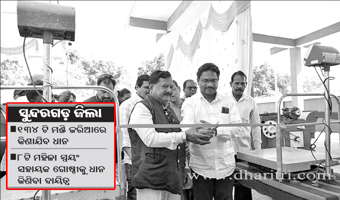 ସୁନ୍ଦରଗଡ଼, ୧୬।୧୨(ଡି.ଏନ୍.ଏ.): ସୁନ୍ଦରଗଡ଼ ଜିଲାରେ ୨୦୨୨-୨୩ ବର୍ଷ ପାଇଁ ଖରିଫ ଧାନ କିଣା ପ୍ରକ୍ରିୟା ଆରମ୍ଭ ହୋଇଛି। ଗୁରୁବାର ସବ୍ଡେଗା ବ୍ଲକର କରମଡିହି ଲ୍ୟାମ୍ପ୍ସଠାରେ ଧାନ ମଣ୍ଡିକୁ ସୁନ୍ଦରଗଡ଼ ସଦର ଉପଜିଲାପାଳ ଦାଶରଥି ସରାବୁ ଉଦ୍ଘାଟନ କରିଛନ୍ତି। ପର୍ଯ୍ୟାୟକ୍ରମେ ଜିଲାର...