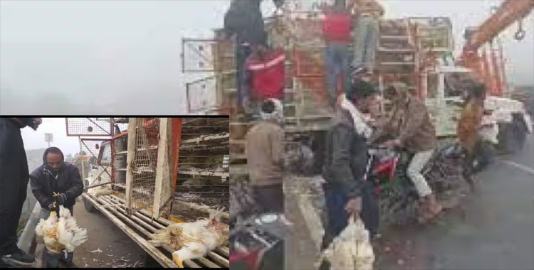 ସଡକ ଦୁର୍ଘଟଣାରେ ଓଲଟିଲା କୁକୁଡା ବୋଝେଇ ଗାଡି, ବୋହିନେଲେ ଲୋକ, ଭିଡିଓ ଭାଇରାଲ