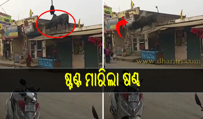 ଦୋକାନ ଛାତ ଉପରକୁ ଚଢିଗଲା ଷଣ୍ଢ: ଆଉ ତା’ପରେ…