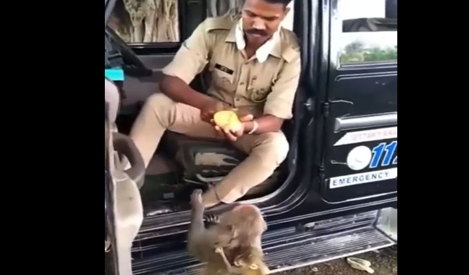 ମାଙ୍କଡ଼କୁ ଆମ୍ବ ଖୁଆଉଛି ପୋଲିସ, ଭିଡିଓ ଦେଖିଲେ