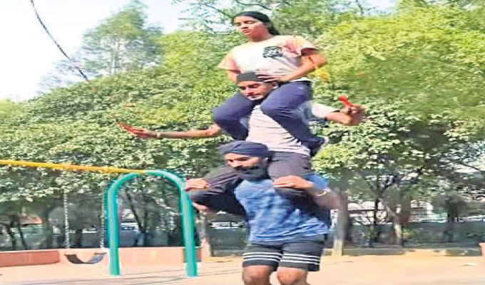 କାନ୍ଧରେ ଦୁଇଜଣଙ୍କୁ ଟେକି ଖେଳିଲେ ସ୍କିପିଂ