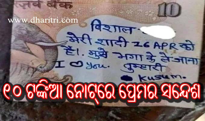 ଆଜିକାଲି ସୋସିଆଲ ମିଡିଆରେ ଅଜବ ଫଟୋ, ଭିଡିଓ ସବୁ ଭାଇରାଲ ହେଉଛି। ଯାହା ଦେଖିଲେ ଚକିତ ହେବେ। ଏବେ ସେମିତି ଜଣେ ଯୁବତୀ ୧୦ ଟଙ୍କିଆ ନୋଟ୍ରେ ତାଙ୍କ ପ୍ରେମିକଙ୍କ ଉଦ୍ଦେଶ୍ୟରେ କିଛି ଲେଖିଛନ୍ତି। ଯାହା ଖୁବ୍ ଭାଇରାଲ ହେଉଛି।...