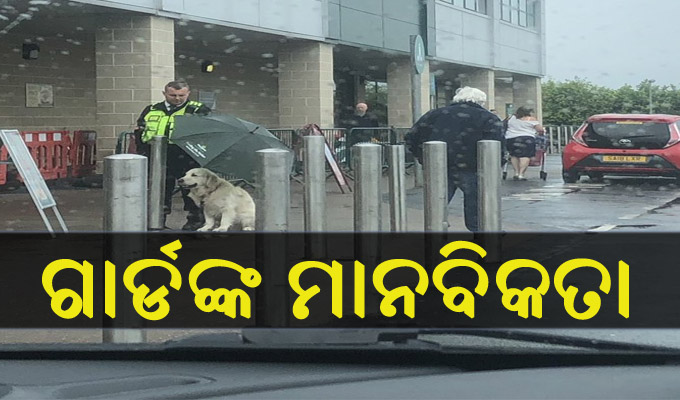 ନିଜେ ଭିଜି କୁକୁରକୁ ବର୍ଷାରୁ ରକ୍ଷା କଲେ ସିକ୍ୟୁରିଟୀ ଗାର୍ଡ