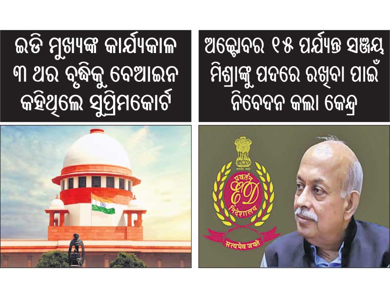 ନୂଆଦିଲ୍ଲୀ,୨୭ା୭: ପ୍ରବର୍ତ୍ତନ ନିର୍ଦ୍ଦେଶାଳୟ (ଇଡି) ମୁଖ୍ୟ ସଞ୍ଜୟ କୁମାର ମିଶ୍ରାଙ୍କ ଲଗାତର କାର୍ଯ୍ୟକାଳ ବୃଦ୍ଧିକୁ ବେଆଇନ ଦର୍ଶାଇ ଜୁଲାଇ ୩୧ରେ ପଦ ଛାଡ଼ିବାକୁ ସୁପ୍ରିମକୋର୍ଟ ନିର୍ଦ୍ଦେଶ ଦେଇଥିଲେ। ଏହି ଅବଧି ପୂରିବାକୁ ଆଉ ୫ ଦିନ ବାକି ଥିବାବେଳେ ସଞ୍ଜୟଙ୍କୁ ଇଡି…