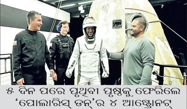 ଓ୍ବାଶିଂଟନ, ୧୬।୯: ଆମେରିକୀୟ ମହାକାଶଯାନ ନିର୍ମାତା କମ୍ପାନୀ ‘ସ୍ପେସ୍ଏକ୍ସ’ର ‘ପୋଲାରିସ୍ ଡନ୍’ ମିଶନ ସଫଳତାର ସହ ସମାପ୍ତ ହୋଇଛି। ଫ୍ଲୋରିଡାର ଡ୍ରାଏ ଟର୍ଟୁଗାସ ଦ୍ୱୀପ ଉପକୂଳରେ ୪ ମହାକାଶଚାରୀଙ୍କ ସହ ଡ୍ରାଗନ୍ କ୍ୟାପ୍ସୁଲ ସଫଳତାର ସହ ଅବତରଣ କରିଛି। ମହାକାଶରୁ ଫେରିବା...