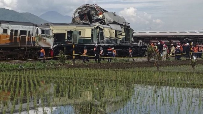 ଜାକର୍ତ୍ତା,୫।୧: ଇଣ୍ଡୋନେସିଆର ମୁଖ୍ୟ ଦ୍ୱୀପ ଜାଭାରେ ଶୁକ୍ରବାର ଦୁଇଟି ଟ୍ରେନ ଧକ୍କା ହୋଇଥିଲା। ଅଧିକାରୀ କହିଛନ୍ତି ଯେ ଏହି ଦୁର୍ଘଟଣାରେ ଟ୍ରେନ କୋଚ ଓଲଟି ପଡିଛି ଯେଉଁଥିରେ ଏପର୍ଯ୍ୟନ୍ତ ତିନି ଜଣଙ୍କର ମୃତ୍ୟୁ ଘଟିଛି।ଜାତୀୟ ରେଳବାଇ ପିଟି କେରେଟା ଏପି...