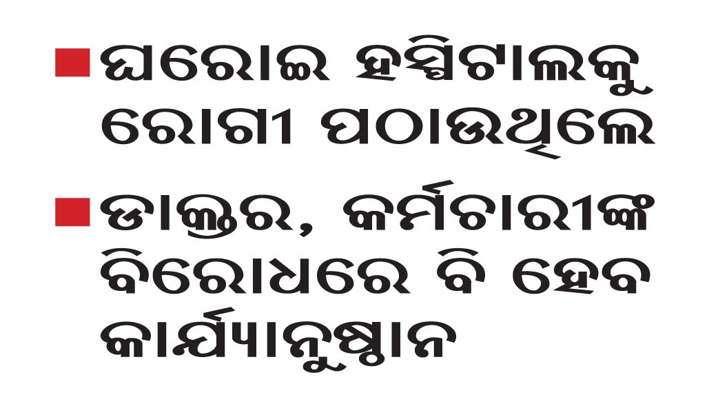 ଭୁବନେଶ୍ୱର,୨୭ା୯(ବ୍ୟୁରୋ) :ସରକାରୀ ହସ୍ପିଟାଲକୁ ଆସୁଥିବା ରୋଗୀଙ୍କୁ ନାନା ଭାବେ ପ୍ରଭାବିତ ଓ ପ୍ରଲୋଭିତ କରି ଘରୋଇ ହସ୍ପିଟାଲକୁ ପଠାଯାଉଛି। ସେଠାରେ ନାନା ଭାବେ ରୋଗୀଙ୍କୁ ଶୋଷଣ କରାଯାଉଛି।…