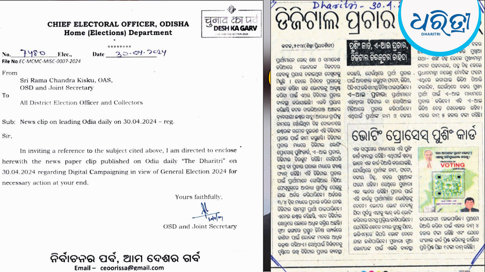 କଟକ,୫ା୫(ଶିଳ୍ପା ପ୍ରିୟଦର୍ଶିନୀ)ନିର୍ବାଚନ ସମ୍ପର୍କୀତ ଡିଜିଟାଲ ପ୍ରଚାର ଖବର ଗତ ୩୦ତାରିଖରେ ଧରିତ୍ରୀରେ ପ୍ରକାଶ ପାଇଥିଲା। ସେହିଦିନ ଓଏସ୍ଡିର ଯୁଗ୍ମ ସମ୍ପାଦକ ରାମଚନ୍ଦ୍ର କିସ୍କୁ ୩୦ ଜିଲାର ଜିଲାପାଳଙ୍କୁ…