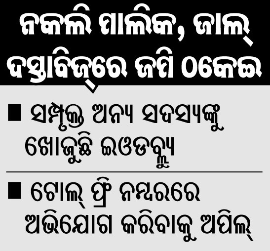 ଭୁବନେଶ୍ୱର,୬।୩(ବ୍ୟୁରୋ):ରାଜଧାନୀରେ ଏକାଧିକ ଜମି ଠକେଇ ର଼୍ୟାକେଟ ସକ୍ରିୟ ରହିଛନ୍ତି। ନକଲି ମାଲିକ ଓ ଜାଲ ଦସ୍ତାବିଜ୍ରେ ଜମି ବିକ୍ରି କରି ବିପୁଳ ଟଙ୍କା ଠକି ନେଉଛନ୍ତି। ନିକଟରେ କ୍ରାଇମବ୍ରାଞ୍ଚର ଅର୍ଥନୈତିକ ଅପରାଧ ଶାଖା (ଇଓଡବ୍ଲ୍ୟୁ) ଏହିପରି ଏକ ର଼୍ୟାକେଟକୁ ଠାବ...