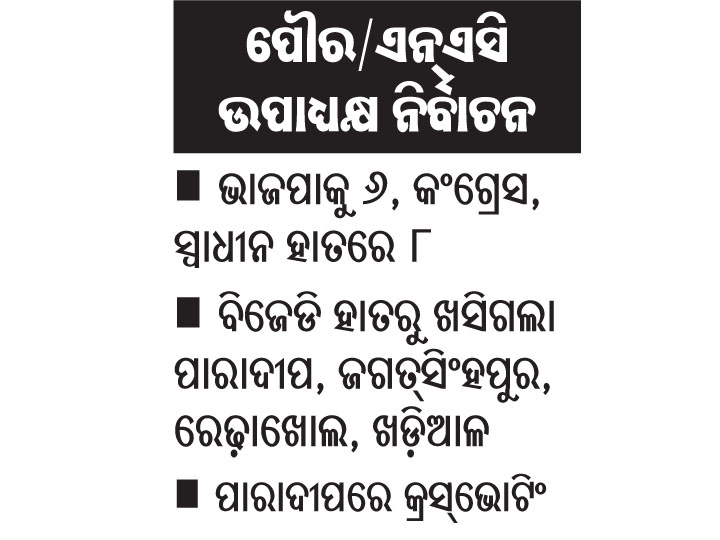 ଭୁବନେଶ୍ୱର,୮ା୪(ବ୍ୟୁରୋ):ରାଜ୍ୟର ୧୦୫ ପୌର ପରିଷଦ/ଏନ୍ଏସି ଉପାଧ୍ୟକ୍ଷ ପଦବୀ ନିର୍ବାଚନ ଗୁରୁବାର ଶେଷ ହୋଇଛି। ଏହି ନିର୍ବାଚନରେ ମଧ୍ୟ ବିଜେଡିକୁ ବିପୁଳ ସଫଳତା ମିଳିଛି। ମିଳିଥିବା ସୂଚନା ଅନୁଯାୟୀ ବିଜେଡି ୯୧ଟି ଉପାଧ୍ୟକ୍ଷ ପଦ ହାତେଇଛି। ଭାଜପାକୁ ମାତ୍ର ୬ଟି ଉପାଧ୍ୟକ୍ଷ...