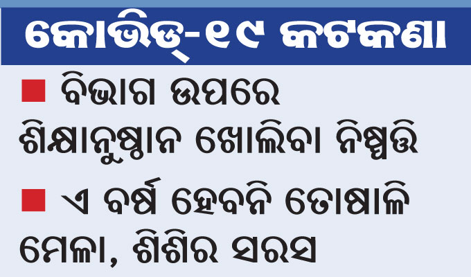ଭୁବନେଶ୍ୱର,୩୦।୧୧(ବ୍ୟୁରୋ)-କରୋନା ସଂକ୍ରମଣକୁ ଦୃଷ୍ଟିରେ ରଖି ଚଳିତ ବର୍ଷ ହେବ ନାହିଁ ତୋଷାଳି କ୍ରାଫ୍ଟ ମେଳା ଏବଂ ଶିଶିର ସରସ ମେଳା। ଏହି ବାଣିଜି୍ୟକ ମେଳା ଉପରେ ରାଜ୍ୟ ସରକାର କଟକଣା ଜାରି କରିଛନ୍ତି। ଏ ନେଇ ସୋମବାର ସ୍ବତନ୍ତ୍ର ରିଲିଫ...