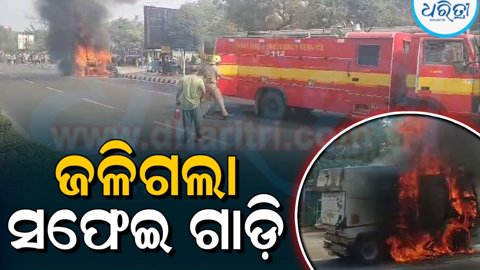 ରାସ୍ତା ମଝିରେ ହୁତୁହୁତୁ ହୋଇ ଜଳିଗଲା ସଫେଇ ଗାଡ଼ି