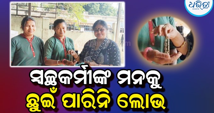 ଭୁବନେଶ୍ୱର,୧୮।୧୨: ସ୍ବଚ୍ଛକର୍ମୀଙ୍କ ମନକୁ ଛୁଇଁ ପାରିନି ଲୋଭ। ଅଳିଆ ଗଦାରୁ ଲକ୍ଷାଧିକ ଟଙ୍କାର ସୁନା ପାଇଲେ ବି ତାହାକୁ ପ୍ରକୃତ ମାଲିକଙ୍କୁ ଫେରାଇ ଅନ୍ୟମାନଙ୍କ ପାଇଁ ପାଲଟିଛନ୍ତି ଉଦାହରଣ । ଏପରି ଏକ ଘଟଣା ଘଟିଛିରାଜଧାନୀ ଭୁବନେଶ୍ୱରରେ । ରାଜଧାନୀରେ...