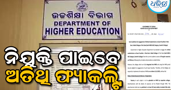 ଭୁବନେଶ୍ୱର,୨୩ା୧୦: ଅତିଥି ଫ୍ୟାକଲ୍ଟି ନିଯୁକ୍ତି ପାଇଁ ଉଚ୍ଚଶିକ୍ଷା ବିଭାଗ ପକ୍ଷରୁ ନିର୍ଦ୍ଦେଶାବଳୀ ଜାରି ହୋଇଛି। ୪୮୮ ଓ ୬୬୨ ବର୍ଗ, ସଂସ୍କୃତ ବିଦ୍ୟାଳୟରେ ନିଯୁକ୍ତି ପାଇଁ ଏହି ନିର୍ଦ୍ଦେଶାବଳୀ ଜାରି ହୋଇଛି। ଅବସରପ୍ରାପ୍ତ ଶିକ୍ଷାବିତ୍ଙ୍କୁ ଅତିଥି ଫ୍ୟାକଲ୍ଟି ଭାବେ ନିଯୁକ୍ତି...