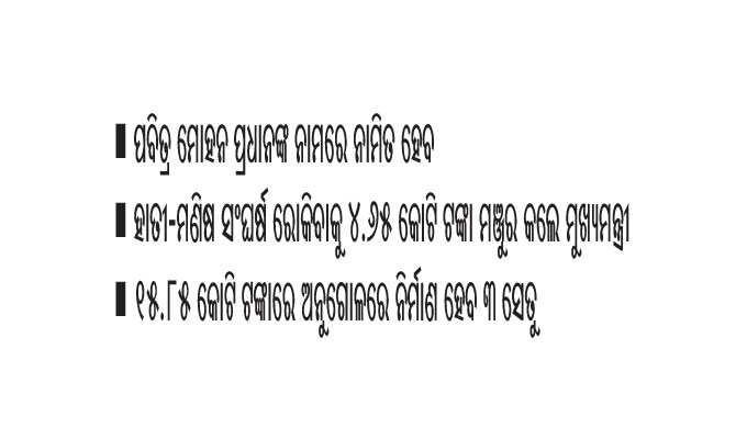 ଭୁବନେଶ୍ୱର,୧୨।୭(ଅନିଲ ଦାସ): ଦେଶର ସ୍ବାଧୀନତା ସଂଗ୍ରାମରେ ତଥା ଓଡ଼ିଶାର ବିକାଶରେ ବିଶିଷ୍ଟ ଜନନେତା ପବିତ୍ର ମୋହନ ପ୍ରଧାନଙ୍କ ଅବଦାନକୁ ସମ୍ମାନ ଦେଇ ତାଙ୍କ ସ୍ମୃତିପୀଠର ବିକାଶ କରାଯିବ। ତାଳଚେର ମେଡିକାଲ କଲେଜ ଓ ହସ୍ପିଟାଲକୁ ମଧ୍ୟ ତାଙ୍କ ନାମରେ ନାମିତ...