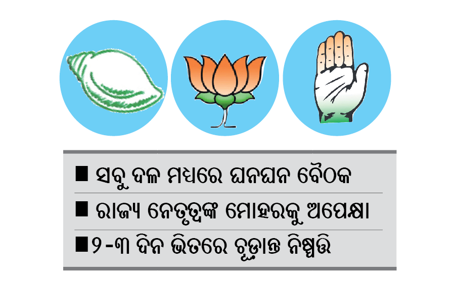 ଢେଙ୍କାନାଳ ଅଫିସ୍, ୩ା୩: ଆସନ ସୀମିତ, କିନ୍ତୁ ଆଶାୟୀ ମାଳମାଳ। କାହାକୁ ଟିକେଟ ମିଳିବ, ଟିକେଟ ନ ମିଳିଲେ ବିକଳ୍ପ କ’ଣ ହେବ, ଟିକେଟ ବଣ୍ଟନ ପରେ ଦଳରେ ବିଦ୍ରୋହ ବଢ଼ିଲେ ତାହାକୁ କିପରି ପ୍ରଶମିତ କରାଯିବ ଏଭଳି ଏକାଧିକ ପ୍ରଶ୍ନର...