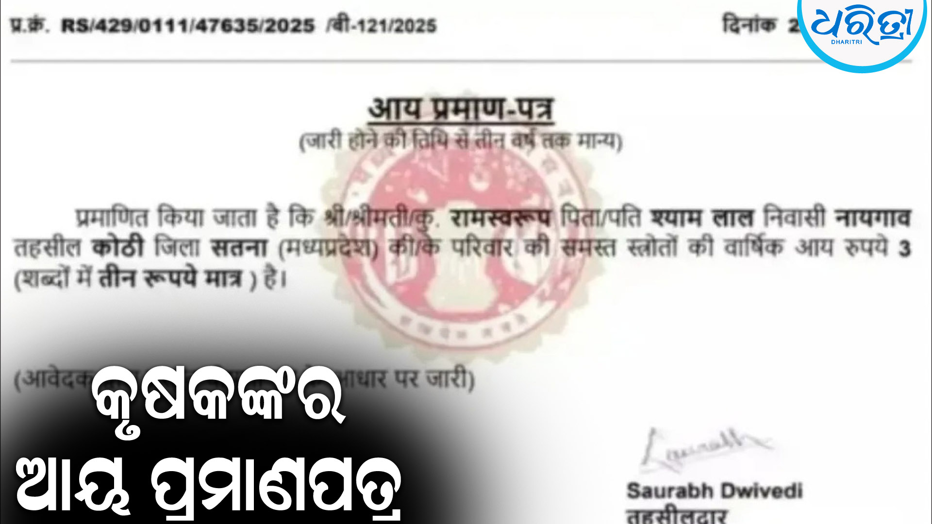 ସତ୍ନା,୨୮।୭ (ପି.ଟି.):ମଧ୍ୟପ୍ରଦେଶର ସତ୍ନା ଜିଲାର କୋଠି ତହସିଲ ଅନ୍ତର୍ଗତ ନାଓଗଁା ନିବାସୀ ରାମସ୍ବରୂପ (୪୫) ନାମକ ଜଣେ କୃଷକଙ୍କର ଆୟ ପ୍ରମାଣପତ୍ର ଏବେ ସୋସିଆଲ ମିଡ଼ିଆରେ ଭାଇରାଲ…