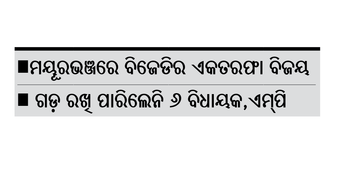 ବାରିପଦା ଅଫିସ,୨୮ା୨: ୨୦୧୭ ତ୍ରିସ୍ତରୀୟ ପଞ୍ଚାୟତ ନିର୍ବାଚନରେ ମୟୂରଭଞ୍ଜ ଜିଲାର ମୋଟ ୫୬ ଜିଲା ପରିଷଦ ଜୋନ୍ ମଧ୍ୟରୁ ୪୯ଟି ହାସଲ କରି ରାଜ୍ୟରେ ଚହଳ ପକାଇଥିବା ଭାଜପା ଚଳିତ ନିର୍ବାଚନରେ ଖାତା ଖୋଲିପାରି ନାହିଁ। ଦ୍ୱିତୀୟ ଦିନ ଗଣତି...