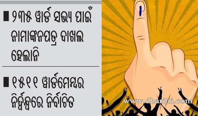 ଯାଜପୁର ଅଫିସ,୨୮ା୧: ଯାଜପୁର ଜିଲାର ୨୩୫ ୱାର୍ଡ ସଭ୍ୟ ପଦବୀ ପାଇଁ କେହି ନାମାଙ୍କନପତ୍ର ଦାଖଲ କରିନାହାନ୍ତି। ଏହାବାଦ୍ ୧୫୧୧ ୱାର୍ଡମେମ୍ବର ନିର୍ଦ୍ୱନ୍ଦ୍ୱରେ ନିର୍ବାଚିତ ହୋଇଛନ୍ତି। ତ୍ରିସ୍ତରୀୟ ପଞ୍ଚାୟତ ନିର୍ବାଚନରେ ଅଂଶଗ୍ରହଣ କରିବାକୁ କ୍ରମଶଃ ଅନାଗ୍ରହ ଦେଖା ଦେଉଥିବା ଏଥିରୁ...