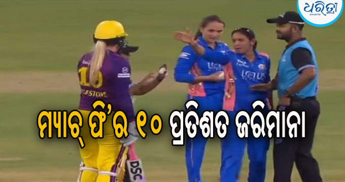 ଲକ୍ଷ୍ନୌ,୭ା୩: ମୁମ୍ବାଇ ଇଣ୍ଡିଆନ୍ସ ଅଧିନାୟକ ହରମନପ୍ରୀତ୍ କୌରଙ୍କୁ ଶୁକ୍ରବାର ତାଙ୍କ ମ୍ୟାଚ୍ ଫି’ର ୧୦ ପ୍ରତିଶତ ଜରିମାନା ହୋଇଛି। ଗୁରୁବାର ସ୍ଥାନୀୟ ଏକ୍ନା କ୍ରିକେଟ ଷ୍ଟାଡିୟମରେ ୟୁପି ଓ୍ବାରିଅର୍ଜ ବିପକ୍ଷ ଓମେନ୍ସ ପ୍ରମିମିୟର ଲିଗ୍ (ଡବ୍ଲ୍ୟୁପିଏଲ୍) ମ୍ୟାଚରେ ସେ ଅମ୍ପାୟରଙ୍କ...