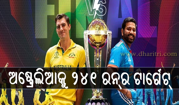 ଅହମ୍ମଦାବାଦ୍,୧୯।୧୧: ଦିନିକିଆ ବିଶ୍ୱକପ୍ ଫାଇନାଲ୍ରେ ଅଷ୍ଟ୍ରେଲିଆକୁ ୨୪୧ ରନ୍ର ଟାର୍ଗେଟ୍ ଦେଇଛି ଭାରତ। ଟସ୍ ହାରି ପ୍ରଥମେ ବ୍ୟାଟିଂ କରିଥିବା ଭାରତ ୫୦ ଓଭରରେ ୨୪୦ ରନ୍ରେ ଅଲଆଉଟ୍ ହୋଇଛି। ଭାରତ ପକ୍ଷରୁ କେଏଲ୍ ରାହୁଲ ସର୍ବାଧିକ ୬୬ ରନ୍...