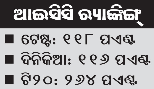 ନୂଆଦିଲ୍ଲୀ, ୨୩।୯: କ୍ରିକେଟର ୩ ଫର୍ମାଟ, ଟେଷ୍ଟ, ଦିନିକିଆ ଓ ଟି୨୦ ର଼୍ୟାଙ୍କିଙ୍ଗ୍ରେ ଭାରତ ନମ୍ବର ଓ୍ବାନ ହୋଇ ଇତିହାସ ରଚିଛି। ପୂର୍ବରୁ ଟେଷ୍ଟ ଓ ଟି୨୦ରେ ଭାରତ ଶୀର୍ଷରେ ଥିବାବେଳେ ଶୁକ୍ରବାର ମୋହାଲିରେ ଅଷ୍ଟ୍ରେଲିଆକୁ ହରାଇବାପରେ ଦିନିକିଆରେ ମଧ୍ୟ...