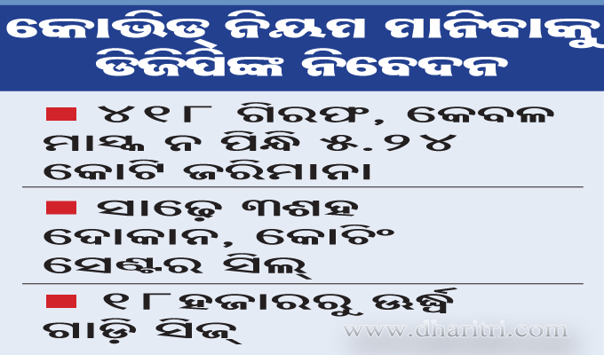 ଭୁବନେଶ୍ୱର,୩୦।୪(ବ୍ୟୁରୋ): ଅମାନିଆଙ୍କ ପାଇଁ ଓଡ଼ିଶାରେ ହୁହୁ ହୋଇ ସଂକ୍ରମଣ ବଢ଼ୁଛି। ଜରିମାନା ଓ ଗିରଫ ସତ୍ତ୍ୱେ କୋଭିଡ୍ ନିୟମ ଉଲ୍ଲଂଘନ ହେଉଥିବାରୁ ସ୍ଥିତି ବିଗିଡିବାରେ ଲାଗିଛି। ଏ ପରିସ୍ଥିତିରେ କରୋନା ମହାମାରୀର ଭୟାବହତାକୁ ନେଇ ପୋଲିସ ଡିଜି ଅଭୟ ରାଜ୍ୟବାସୀଙ୍କୁ...