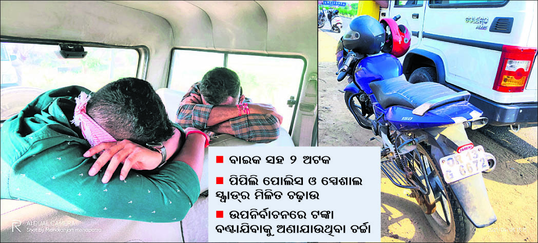 ପିପିଲି,୬।୪ (ଡି.ଏନ୍.ଏ./ସ୍ବ.ପ୍ର.):ପିପିଲିର ତରାକାଜ ଓଭରବ୍ରିଜ୍ଠାରେ ସୋମବାର ପୋଲିସ ଓ ସ୍ପେଶାଲ ସ୍କ୍ବାଡ୍ ମିଳିତ ଭାବେ ଚଢ଼ାଉ କରି ଏକ ବାଇକ ସମେତ ନଗଦ ୫୦ଲକ୍ଷ ଟଙ୍କା ଜବତ କରିଛନ୍ତି। ଏହି ଘଟଣାରେ ଧରାପଡ଼ିଥିବା ୨ଜଣ ଯୁବକଙ୍କୁ ପିପିଲି ଥାନାରେ ଅଟକ...
