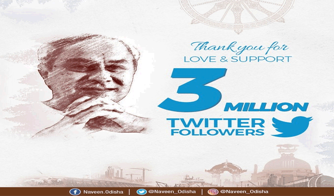 ଭୁବନେଶ୍ୱର,୨୧।୧(ବ୍ୟୁରୋ): ନିକଟରେ ହୋଇଥିବା ସର୍ଭେରେ ଦେଶର ସବୁଠାରୁ ଲୋକପ୍ରିୟ ମୁଖ୍ୟମନ୍ତ୍ରୀ ଭାବେ ବିବେଚିତ ହୋଇଥିଲେ ନବୀନ ପଟ୍ଟନାୟକ। ଏବେ ସେ ନିଜର ଅଫିସିଆଲ ଟୁଇଟର ପୃଷ୍ଠାରେ ୩ ଲକ୍ଷ ଫଲୋଅର୍ ରେଖା ଅତିକ୍ରମ କରିଛନ୍ତି। ନବୀନ ଏନେଇ ଖୁସି ପ୍ରକାଶ...