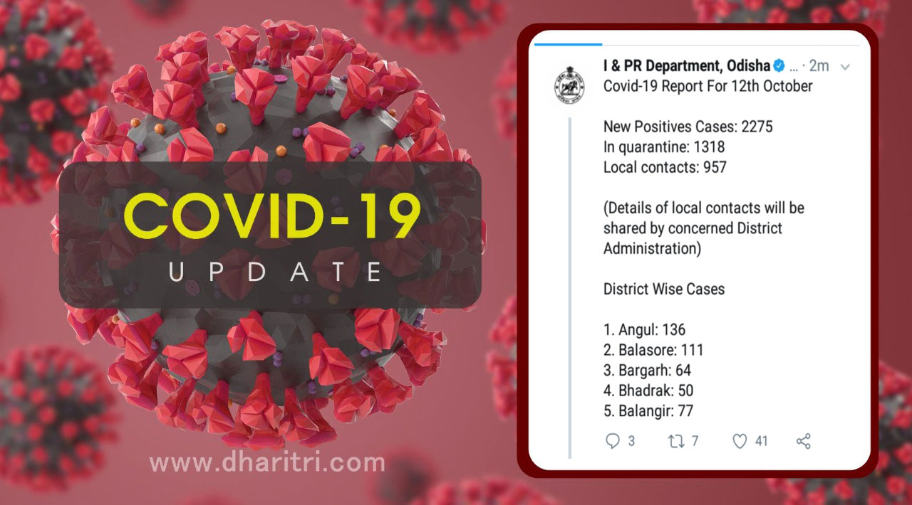 CORONAVIRUS UPDATE: ରାଜ୍ୟରେ ୨୨୭୫ ନୂଆ ପଜିଟିଭ୍ ଚିହ୍ନଟ, ଖୋର୍ଦ୍ଧା ଆଗରେ ଥିଲେ ବି କମିଛି ସଂଖ୍ୟା