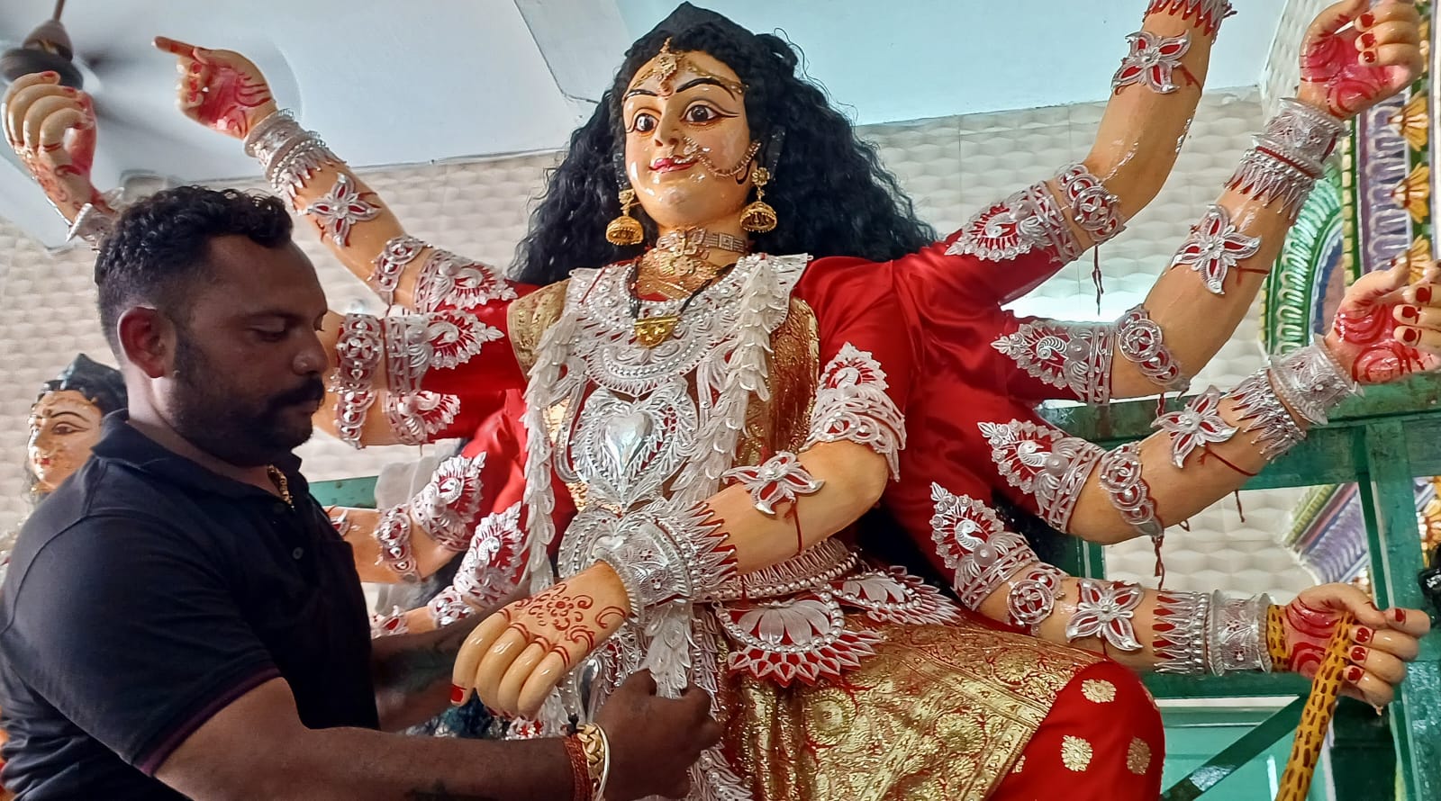 ଜଣେ ବ୍ୟକ୍ତି କଟକସ୍ଥିତ ଶେଖ ବଜାର ଦେବୀ ଦୁର୍ଗାଙ୍କ ମାଟି ପ୍ରତିମାକୁ ସୁନା ଓ ରୂପା ଅଳଙ୍କାରରେ ସଜାଉଛନ୍ତି କଟକଠା ପିଠାପୁର ଠାରେ ଦେବୀ ମାଧାକୁଲେଙ୍କ ଅନ୍ନପୂର୍ଣ୍ଣା…