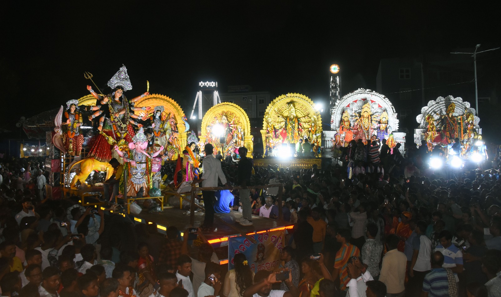 ଭୁବନେଶ୍ୱରରେ ଦେବୀ ଦୁର୍ଗାଙ୍କ ବିସର୍ଜନ ଶୋଭାଯାତ୍ରା ମାଙ୍କ ମୃମୟୀ ମୂର୍ତ୍ତିକୁ କ୍ରେନ୍ ଦ୍ଵାରା କୁଆଖାଇ ନଦୀଠାରେ ଅସ୍ଥାୟୀ ପୋଖରୀରେ ବିସର୍ଜନ କରାଯାଉଛି