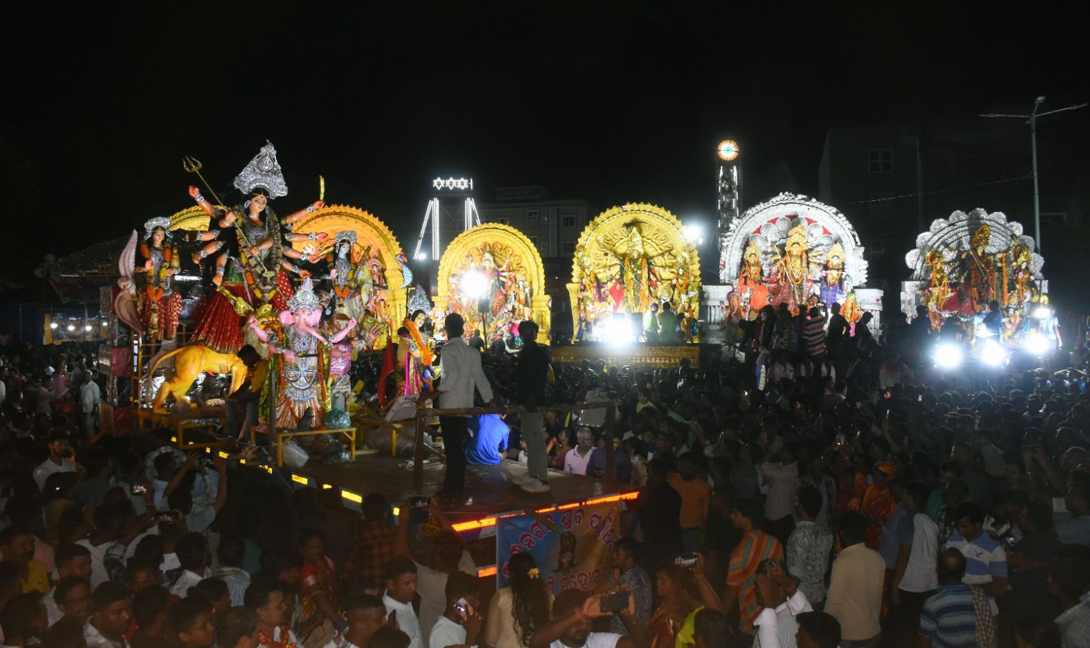 ଭୁବନେଶ୍ୱରରେ ଦେବୀ ଦୁର୍ଗାଙ୍କ ବିସର୍ଜନ ଶୋଭାଯାତ୍ରା ମାଙ୍କ ମୃମୟୀ ମୂର୍ତ୍ତିକୁ କ୍ରେନ୍ ଦ୍ଵାରା କୁଆଖାଇ ନଦୀଠାରେ ଅସ୍ଥାୟୀ ପୋଖରୀରେ ବିସର୍ଜନ କରାଯାଉଛି