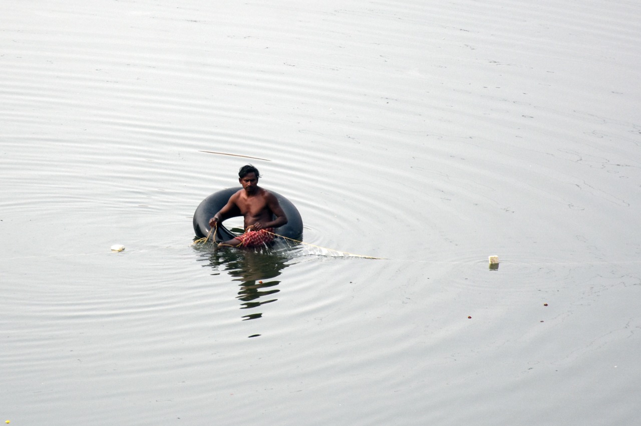 ଭାସମାନ ଟ୍ୟୁବରେ ଥିବା ମତ୍ସ୍ୟଜୀବୀ ଭୁବନେଶ୍ୱର ଉପକଣ୍ଠରେ ଥିବା କୁଆଖାଇ ନଦୀରେ ମାଛ ଧରୁଛନ୍ତି