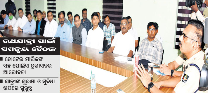 ପୁରୀ ଅଫିସ,୩୧।୫:ଚଳିତ ବର୍ଷର ରଥଯାତ୍ରା ପାଇଁ ସୋମବାର ପୁରୀ ହୋଟେଲ ମାଲିକ ସଂଘ ସହ ପୋଲିସ ପ୍ରଶାସନର ସମନ୍ବୟ ବୈଠକ ଅନୁଷ୍ଠିତ ହୋଇଯାଇଛି। ପୁରୀ ପୋଲିସ କାର୍ଯ୍ୟାଳୟରେ ଆୟୋଜିତ ଏହି ବୈଠକରେ ସହରର ସମସ୍ତ ହୋଟେଲରେ ସିସିଟିଭି କ୍ୟାମେରା ଲଗାଯିବା ବାଧ୍ୟତାମୂଳକ କରାଯିବା ସହ ଯାତ୍ରୀଙ୍କ ସୁରକ୍ଷା ଓ ସୁବିଧା ଉପରେ ଗୁରୁତ୍ୱାରୋପ କରାଯାଇଛି।