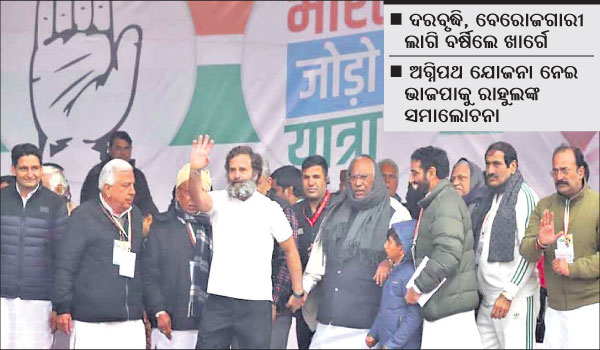 ପାନିପଥ,୭ା୧(ପି.ଟି.): କଂଗ୍ରେସର ଭାରତ ଯୋଡ଼ୋ ଯାତ୍ରା ଅବସରରେ ଦଳ ଅଧ୍ୟକ୍ଷ ମଲ୍ଲିକାର୍ଜୁନ ଖାର୍ଗେ ଶୁକ୍ରବାର ହରିୟାଣାର ପାନିପଥଠାରେ ଏକ ରାଲିକୁ ସମ୍ବୋଧନ କରି ଭାଜପା ନେତୃତ୍ୱାଧୀନ କେନ୍ଦ୍ର ସରକାରଙ୍କୁ ବିଭିନ୍ନ ପ୍ରସଙ୍ଗରେ ସମାଲୋଚନା କରିଛନ୍ତି। ଏହି ସରକାର ଅମଳରେ ଦରଦାମ୍ ଆକାଶଛୁଆଁ ହୋଇଥିବାବେଳେ ବେରୋଜଗାରି ସବୁ ରେକର୍ଡ ଭାଙ୍ଗିଛି। ନିର୍ବାଚନ ବେଳେ ଭାଜପା ବଡ଼ ବଡ଼ ପ୍ରତିଶ୍ରୁତି ଦେଇ କ୍ଷମତାକୁ ଆସିବା ପରେ ସେଗୁଡ଼ିକୁ ଭୁଲି ଯାଇଥିବା ଖାର୍ଗେ କହିଛନ୍ତି। ଏହି ରାଲିରେ କଂଗ୍ରେସ ନେତା ରାହୁଲ ଗାନ୍ଧୀ, କୁମାରୀ ଶୈଲଜା, ଭୂପିନ୍ଦର ସିଂ ହୁଡ଼ା, କେ.ସି. ବେଣୁଗୋପାଳ, ଶକ୍ତିସିଂ ଗୋହିଲ, କିରନ ଚୌଧରୀ, ଡି.କେ. ଶିବକୁମାର ପ୍ରମୁଖ ସାମିଲ ଥିଲେ। ରାହୁଲଙ୍କ ନେତୃତ୍ୱରେ ଭାରତ ଯୋଡ଼ୋ ଯାତ୍ରା ୩,୦୦୦ କିଲୋମିଟରରୁ ଊର୍ଦ୍ଧ୍ୱ ପଥ ଅତିକ୍ରମ କରି ଗୁରୁବାର ହରିୟାଣାରେ ପ୍ରବେଶ କରିଛି।