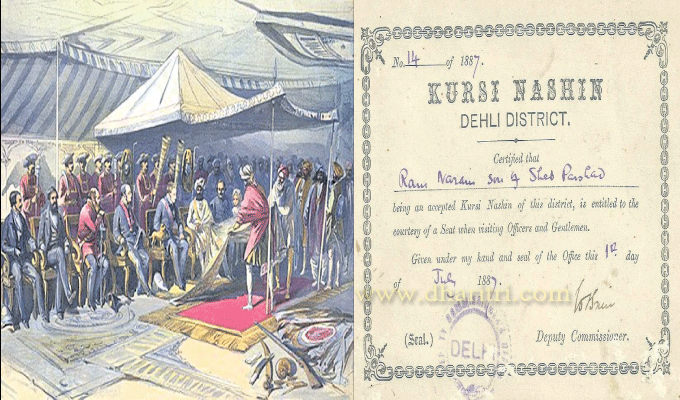 କିଛି ଐତିହାସିକଙ୍କ ମତରେ ବ୍ରିଟିଶ ସରକାର ଏହି ବ୍ୟବସ୍ଥା ମୋଗଲଙ୍କଠାରୁ ଗ୍ରହଣ କରିଥିଲେ। ମୋଗଲ ଦରବାରରେ ଅଳ୍ପ କେତେଜଣ ଖାସ୍ ବ୍ୟକ୍ତିଙ୍କୁ ଛାଡ଼ିଦେଲେ ପ୍ରାୟ ସମସ୍ତେ ସମ୍ରାଟଙ୍କ ସମ୍ମୁଖରେ ଠିଆ ହେଉଥିଲେ। ଯେତେବେଳେ ବିଟିଶ ସରକାର ମୋଗଲ ସମ୍ରାଟମାନଙ୍କୁ ଗାଦିରୁ ହଟାଇ ନିଜେ ଶାସନଭାର ସମ୍ଭାଳିବାକୁ ଲାଗିଲେ ସେମାନେ ଜାଣିବାକୁ ପାଇଲେ ଯେ, ଲୋକଙ୍କ ମନରେ ମୋଗଲ ସମ୍ରାଟଙ୍କ ଦରବାରରେ ବସିବାର ଅଧିକାରକୁ ନେଇ ଧୀରେ ଧୀରେ ପ୍ରତିବାଦ ଆରମ୍ଭ ହେଉଥିଲା। ତେଣୁ ବ୍ରିଟିଶ ସରକାର ଲୋକଙ୍କୁ କିଛିଟା ସନ୍ତୁଷ୍ଟ କରିବା ପାଇଁ କୁର୍ସି ନଶିନ୍ ସାର୍ଟିଫିକେଟ ବ୍ୟବସ୍ଥା ଆରମ୍ଭ କରିଥିଲେ। ଯଦ୍ଦ୍ବାରା ଲୋକେ ସାର୍ଟିଫିକେଟ ପାଇବା ପରେ ବିନା ଦ୍ୱିଧାରେ ଗୋରା ସାହେବଙ୍କ ନିକଟରେ ଚେୟାରରେ ବସିପାରିବେ।