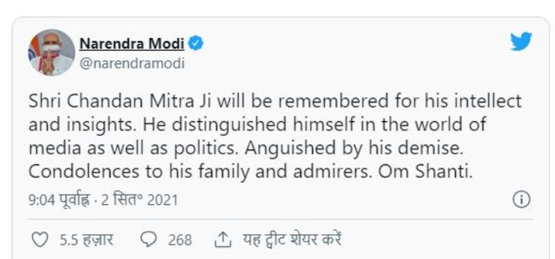 ପ୍ରଧାନମନ୍ତ୍ରୀ ନରେନ୍ଦ୍ର ମୋଦି ଟୁଇଟ କରି ଶୋକ ପ୍ରକାଶ କରିଛନ୍ତି। ପ୍ରଧାନମନ୍ତ୍ରୀ କହିଛନ୍ତି ଯେ, ଶ୍ରୀ ଚନ୍ଦନ ମିତ୍ରଙ୍କୁ ତାଙ୍କର ଜ୍ଞାନ ଏବଂ ବୁଦ୍ଧି ପାଇଁ ସ୍ମରଣ କରାଯିବ। ସେ ଗଣମାଧ୍ୟମରେ ତଥା ରାଜନୀତି ଜଗତରେ ନିଜର ପରିଚୟ ସୃଷ୍ଟି କରିଥିଲେ। ତାଙ୍କ ମୃତ୍ୟୁରେ ମୁଁ ଆଘାତ ପାଇଛି। ତାଙ୍କ ପରିବାର ଏବଂ ପ୍ରଶଂସକଙ୍କ ପ୍ରତି ସମବେଦନା ଜ୍ଞାପନ କରୁଛି।