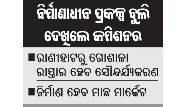 ରାଣୀହାଟ ନିକଟରୁ ଗୋଶାଳା ପର୍ଯ୍ୟନ୍ତ ଯାଇଥିବା ରାସ୍ତାର ସୌନ୍ଦର୍ଯ୍ୟକରଣ ପାଇଁ ମାଷ୍ଟର ପ୍ଲାନ ପ୍ରସ୍ତୁତ କରିବାକୁ ସିଏମ୍ସି ଇଞ୍ଜିନିୟରିଂ ବିଭାଗକୁ କମିଶନର ପରାମର୍ଶ ଦେଇଥିଲେ। ଏହାପରେ ଛତ୍ରବଜାରଠାରେ ନିର୍ମାଣାଧୀନ ଅର୍ବାନ ହାଟ ପରିଦର୍ଶନ କରିଥିଲେ। ଏପ୍ରିଲ ପୂର୍ବରୁ ଏହି ପ୍ରକଳ୍ପ କାର୍ଯ୍ୟ ଶେଷ କରିବା ପାଇଁ ସେ ବିଭାଗୀୟ ଯନ୍ତ୍ରୀଙ୍କୁ ନିର୍ଦ୍ଦେଶ ଦେଇଛନ୍ତି। ଏତଦ୍ବ୍ୟତୀତ ସେଠାରେ ଏକ ମାଛ ମାର୍କେଟ ସ୍ଥାପନ ପାଇଁ ତୁରନ୍ତ ବ୍ଲୁ ପ୍ରିଣ୍ଟ ପ୍ରସ୍ତୁତ କରିବାକୁ ସମ୍ପୃକ୍ତ ଅଧିକାରୀଙ୍କୁ ପରାମର୍ଶ ଦେଇଥିଲେ। ଏହାପରେ କଲ୍ୟାଣସ୍ଥିତ ମାତୃଭବନ ନିକଟରେ ଚାଲିଥିବା ଜାଇକା କାମ ତଦାରଖ କରି ବର୍ଷାଦିନ ପୂର୍ବରୁ ପମ୍ପିଂ ଷ୍ଟେଶନ କାର୍ଯ୍ୟକ୍ଷମ ଓ ଠିକ୍ ପରିଚାଳନା କରିବାକୁ ଦାୟିତ୍ୱରେ ଥିବା ଯନ୍ତ୍ରୀଙ୍କୁ କହିଥିଲେ। ଏଥିସହ ନୂଆବଜାରସ୍ଥିତ ଗାନ୍ଧିଛକ କେନାଲ ପାଖରେ ଥିବା ନୀଳକଣ୍ଠେଶ୍ୱର ପୋଖରୀର ପଙ୍କ ଉଦ୍ଧାର କାର୍ଯ୍ୟ ତଦାରଖ କରିଥିଲେ। ସେହିପରି ଓଏମ୍ପିସ୍ଥିତ ଓଏସ୍ଏପି ନିକଟରେ ହେବାକୁ ଥିବା ମାର୍କେଟ କମ୍ପ୍ଲେକ୍ସର ମାଷ୍ଟର ପ୍ଲାନ ପ୍ରସ୍ତୁତ କରିବା ଲାଗି ବିଭାଗୀୟ ଯନ୍ତ୍ରୀଙ୍କୁ ନିର୍ଦ୍ଦେଶ ଦେଇଥିଲେ। ଏତଦ୍ବ୍ୟତୀତ ନିର୍ମାଣାଧୀନ ଡିଏଭି ସ୍କୁଲ କାର୍ଯ୍ୟ ଶୀଘ୍ର ଶେଷ କରିବାକୁ ସେ ବିଭାଗୀୟ ଅଧିକାରୀଙ୍କୁ ତାଗିଦ କରିଥିଲେ।
