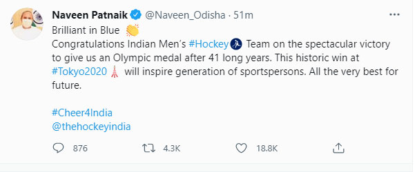ସେହିପରି ହକିର ପୂର୍ବତନ ଅଧିନାୟକ ଦିଲ୍ଲୀପ ତିର୍କୀ ମଧ୍ୟ ଅଭିନନ୍ଦନ ଜଣାଇଛନ୍ତି। ଯାହା ଆମେ କରିପାରି ନ ଥିଲୁ ତାହା ଆଜି ପୂରଣ ହୋଇଛି। ଅଲିମ୍ପିକ୍ସରେ ଇତିହାସ ରଚିଛି ଭାରତୀୟ ହକି ଦଳ ବୋଲି ଦିଲ୍ଲୀପ କହିଛନ୍ତି। ଓଡ଼ିଆ ଖେଳାଳି ଅମିତ ରୋହିଦାସ ଓ ବିରେନ୍ଦ୍ର ଲାକ୍ରାଙ୍କୁ ମଧ୍ୟ ସେ ଶୁଭେଚ୍ଛା ଜଣାଇଛନ୍ତି। ଦୁଇ ଓଡ଼ିଆ ଭାବେ ଅଲିମ୍ପିକ୍ସରେ ବ୍ରୋଞ୍ଜ ଜିତିବା ବଡ଼ ସଫଳତା। ରାଉରକେଲା ସମେତ ସମଗ୍ର ସୁନ୍ଦରଗଡ଼ ଜିଲାରେ ବିଜୟ ଉତ୍ସବ ପାଳନ କରାଯାଉଛି ବୋଲି ଦିଲ୍ଲୀପ ତିର୍କୀ କହିଛନ୍ତି।