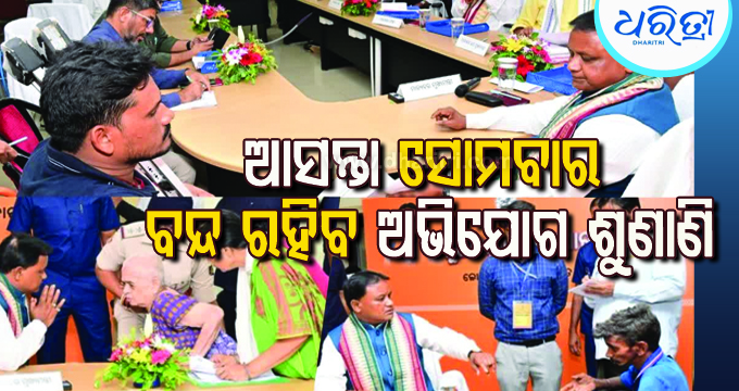 ଭୁବନେଶ୍ୱର,୮।୮(ସୁନିତ୍ ମିଶ୍ର): ମୁଖ୍ୟମନ୍ତ୍ରୀଙ୍କ ଅଭିଯୋଗ ପ୍ରକୋଷ୍ଠରେ ଆସନ୍ତା ୧୨ ତାରିଖରେ ମୁଖ୍ୟମନ୍ତ୍ରୀଙ୍କ ଜନ ଅଭିଯୋଗ ଶୁଣାଣି କାର୍ଯ୍ୟକ୍ରମ ବନ୍ଦ ରହିବ। ଜନ ଅଭିଯୋଗ ଶୁଣାଣିର ପରବର୍ତ୍ତୀ ତାରିଖ ଜନସାଧାରଣଙ୍କୁ ଗଣମାଧ୍ୟମ ଜରିଆରେ ଜଣାଇଦିଆଯିବ ବୋଲି ସାଧାରଣ ପ୍ରଶାସନ ଓ ସାଧାରଣ ଅଭିଯୋଗ ବିଭାଗ ପକ୍ଷରୁ ସୂଚନା ଦିଆଯାଇଛି। ତେବେ ଆସନ୍ତା ସୋମବାର କେଉଁ କାରଣ ଲାଗି ମୁଖ୍ୟମନ୍ତ୍ରୀଙ୍କ ଜନ ଅଭିଯୋଗ ଶୁଣାଣି କାର୍ଯ୍ୟକ୍ରମ ବନ୍ଦ ରହିବ ସେକଥା ଅବଗତ କରାଯାଇନାହିଁ।